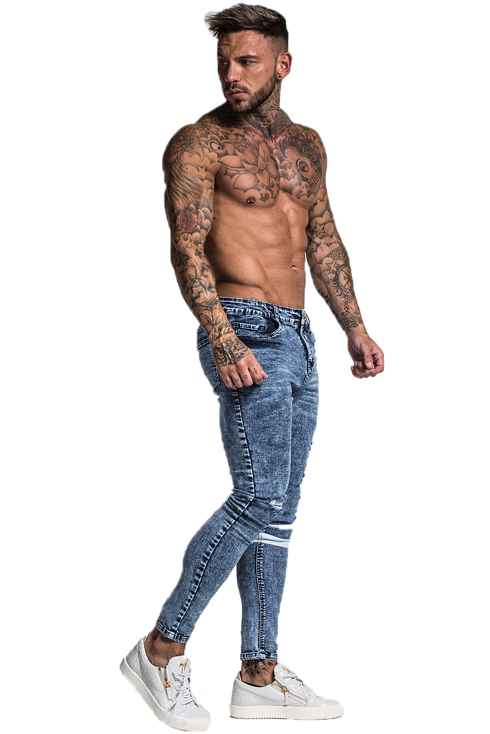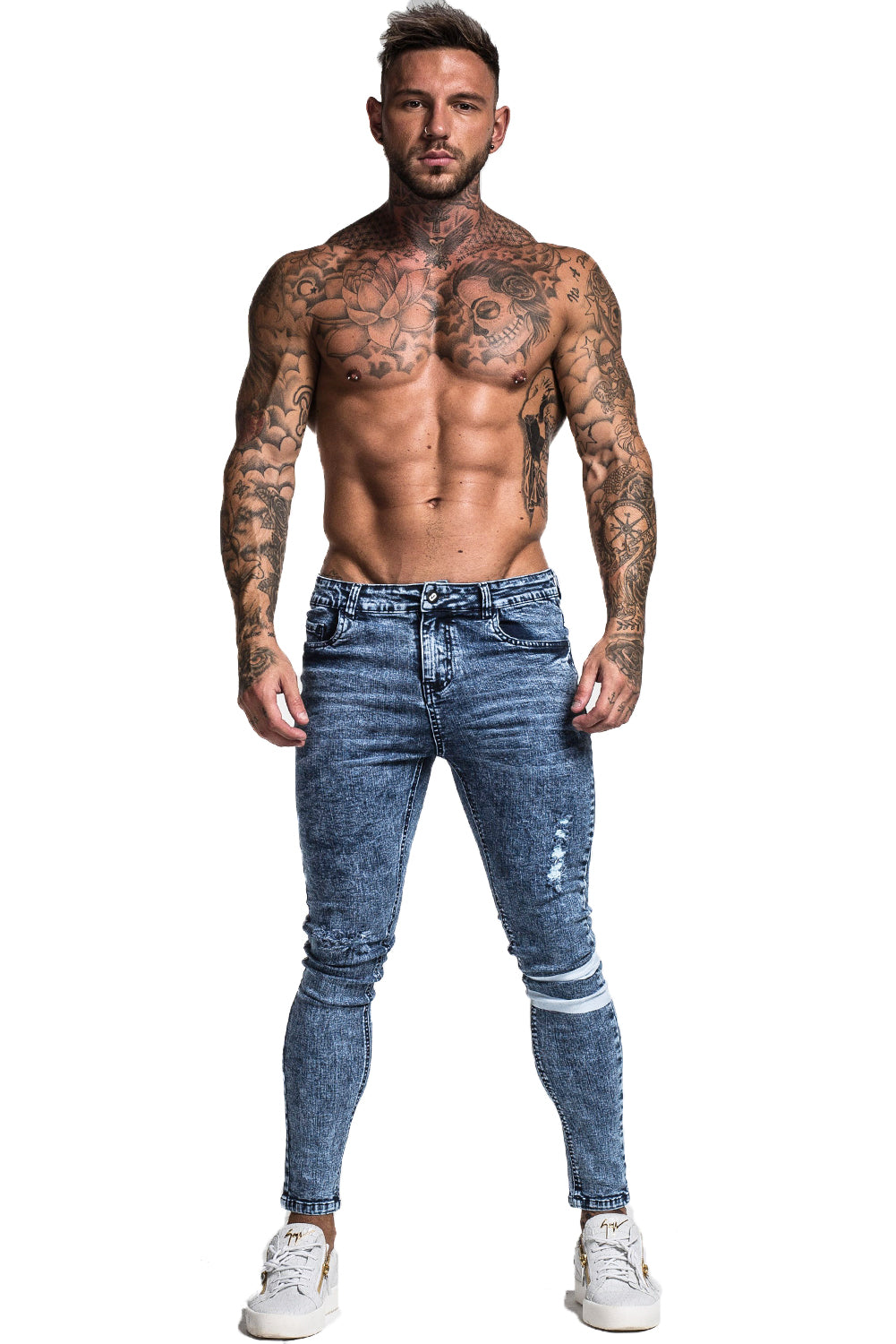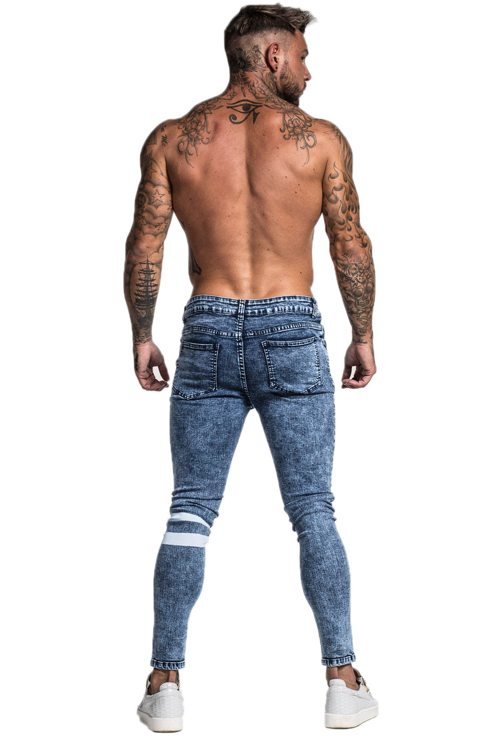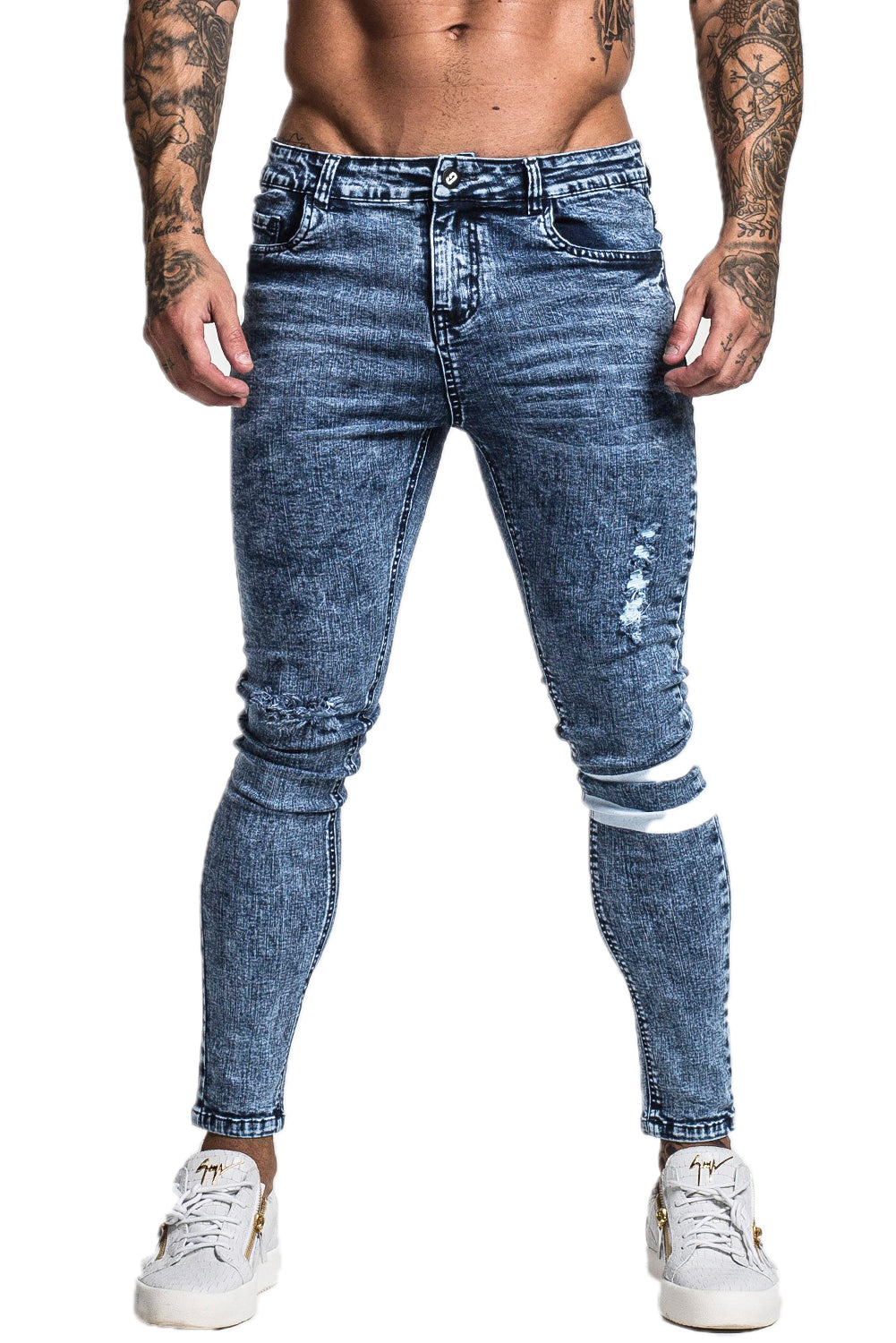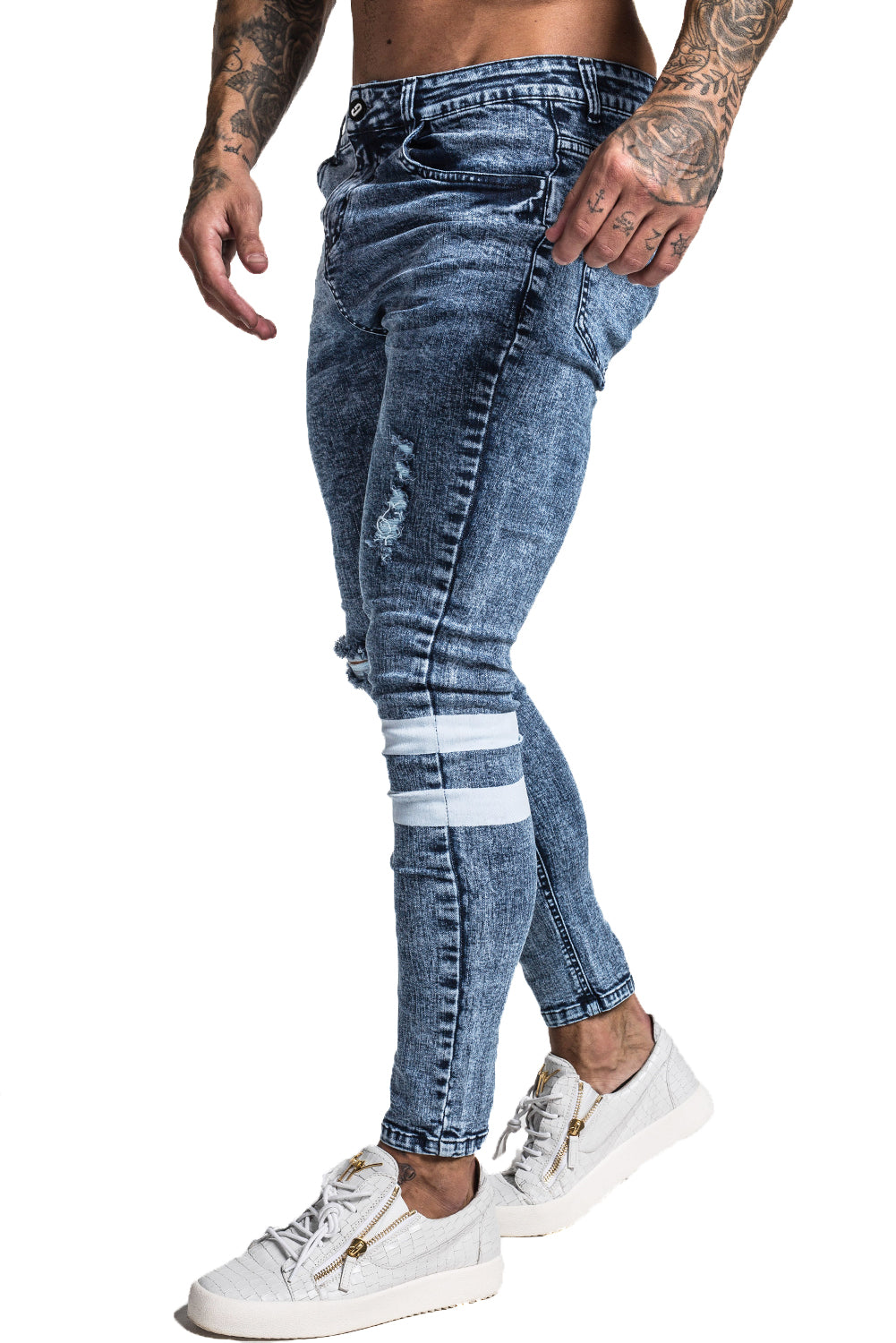Men's Blue Skinny Ripped Jeans with Two White Line Design